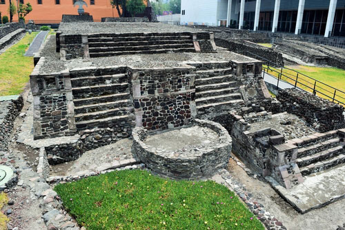 Today, in the center of Mexico City, stands the Plaza de las Tres Culturas or the Plaza of the Three Cultures. In the center of the Plaza are restored remains of an Aztec Temple. A church built by the Spanish conquistadors sits on one side of the square and on the other side lies glass office buildings—symbols of modern Mexico. The Plaza represents the indigenous people, the Spanish, and the mestizos whose histories combined to form the Mexico of today. Click on each picture below to learn more about the Plaza of Three Cultures.