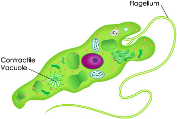 Euglena are unicellular, flagellated protists containing chlorophyll pigments. They also contain carotenoid (a yellow orange pigment found in tomatoes). Euglena are found in salty as well as fresh water and contribute to the green coloring of the waters. They contain a single flagella as shown in the figure and have an organelle called the contractile vacuole, which is used to pump excess water out of the cell. Brown Algae