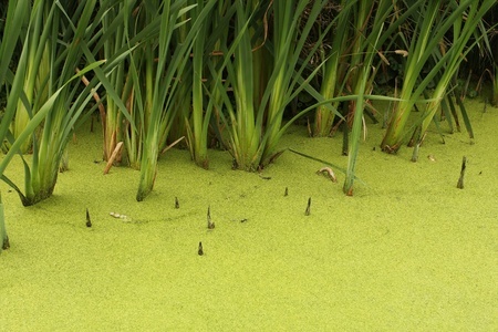 Have you ever come up to a pond or lake edge that looked like the one in the image? The green slime is algae. All of plant-like protists are called algae, and there are as many as 1 million species. Some of the unicellular algae are as small as 10 µm, and some of the multicellular algae can grow up to 60 meters long. Like plants, most of them contain the chlorophyll, the pigment that plants need in order to make food through photosynthesis. Though there is some variation in the specific types, they all generally have the same structures.