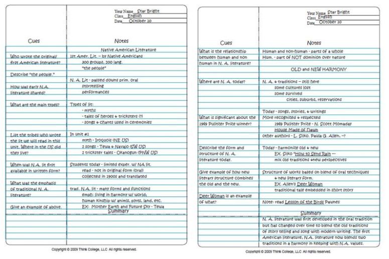 On this page, you will consider two different sets of notes.   You will notice that in both samples the cues reflect the content of the notes and are written in a way that the information might be asked on a quiz or test. Later, when using cues like this to study for an exam, students will fold the cues section back so that they do not see the original notes while quizzing.