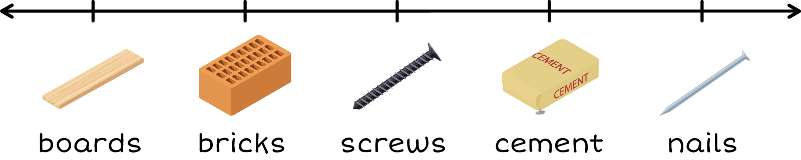 A plot chart. Boards: 8, bricks: 6, screws: 3, cement: 4,