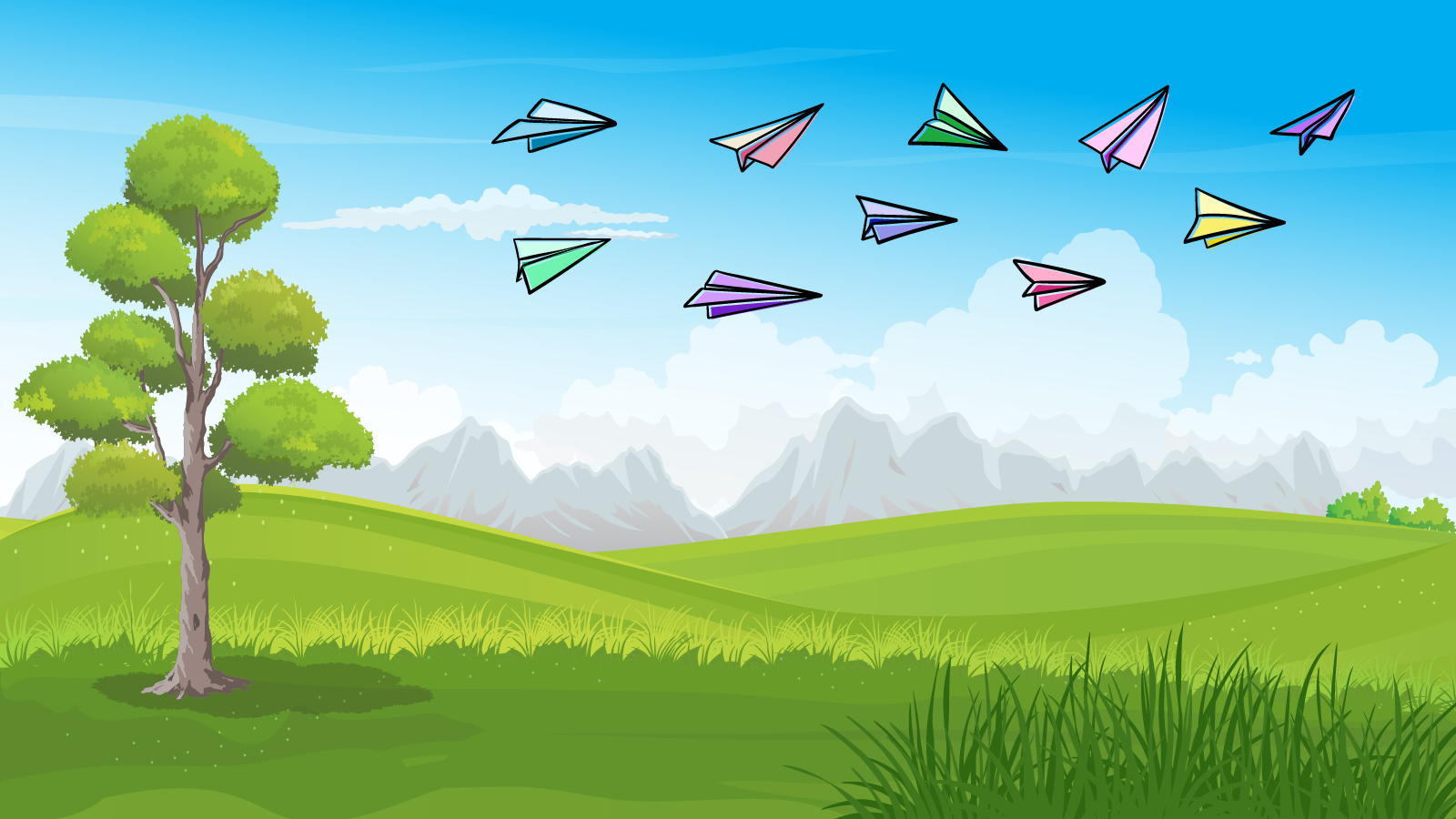 8 paper airplanes flying in the field. Each paper airplane is made of a different color paper.