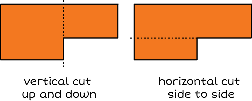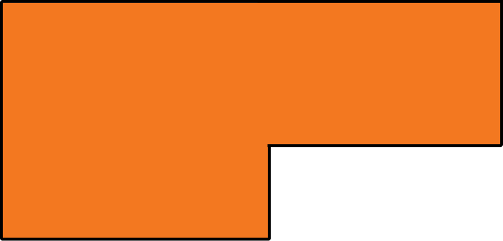 A rectangular shape that looks like two rectangles joined together. One of the rectangles area is smaller than the other. If you cut either of the smaller sides off you would have a perfect rectangle. You can cut vertically up and down or horizontally side to side. To shape the rectangle.