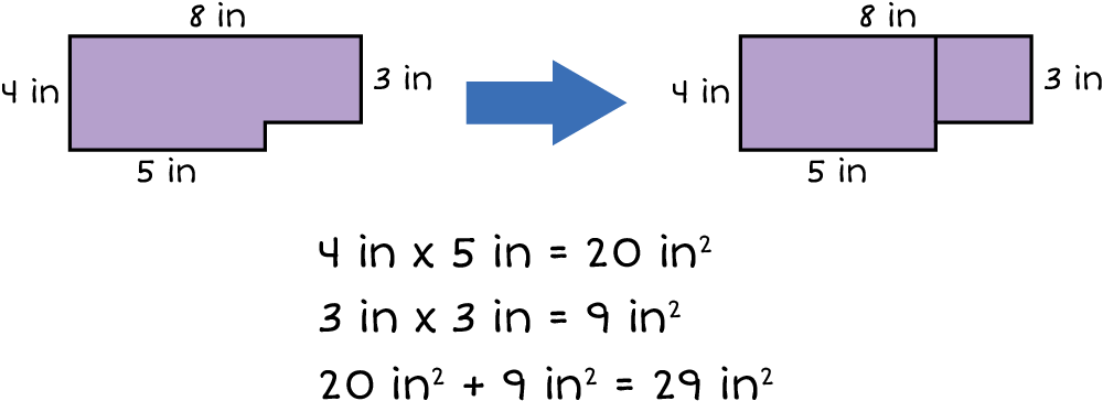 An area with the left width 4 inches the top length 8 inches the right width 3 inches and the bottom length 5 inches we can seperate the shapes at the 5 inches mark vertically up and down. now we can find the area. 4 inches times 5 inches equal 20 inches\({^2}\) next 3 inches times 3 inches equals 9 inches\({^2}\) Now we add the 2 areas together 20 inches\({^2}\) plus 9 inches\({^2}\) equal 29 inches\({^2}\)