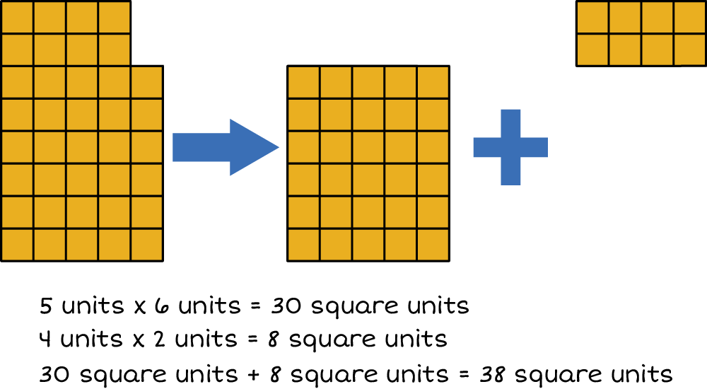 A grid with a 6 units by 5 units on the bottom of the grid and a grid 2 unit by 4 units on the top. An arrow points to how we can deconstruct into two grids. The first grid is 5 units by 6 units. The second grid is 2 units by 4 units. Now we can get the area of the first grid 5 units times 6 units equals 30 square units. Next get the grid for the second grid 4 units times 2 units equals 8 square units. Now we add 30 square units plus 8 square units equals 38 square units.