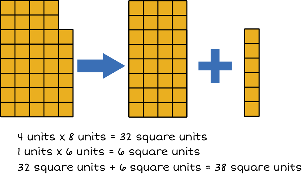 A grid with a 8 units by 4 units on the left of the grid and a grid 1 unit by 6 units on the right. An arrow points to how we can deconstruct into two grids. The first grid is 8 units by 4 units. The second grid is 1 units by 6 units. Now we can get the area of the first grid 4 units times 8 units equals 32 square units. Next get the grid for the second grid 1 units times 6 units equals 6 square units. Now we add 32 square units plus 6 square units equals 38 square units.