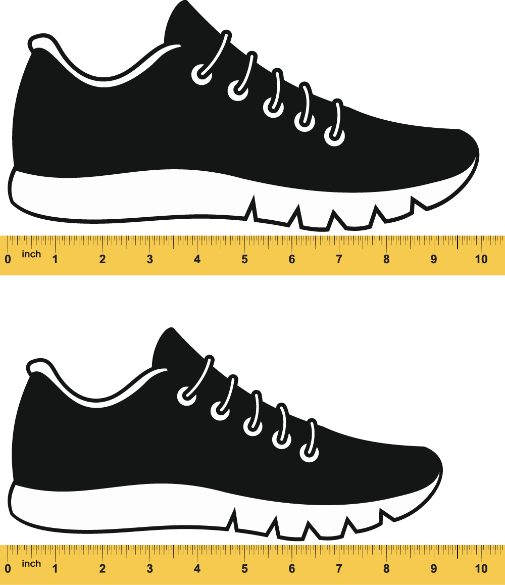 Measure the length of each sneaker below to the nearest inch. What is the length of the sneaker with the greater length?