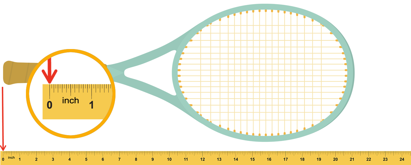 A tennis racket lined up with a ruler. The very end of the handle is lined up with the zero on the ruler.