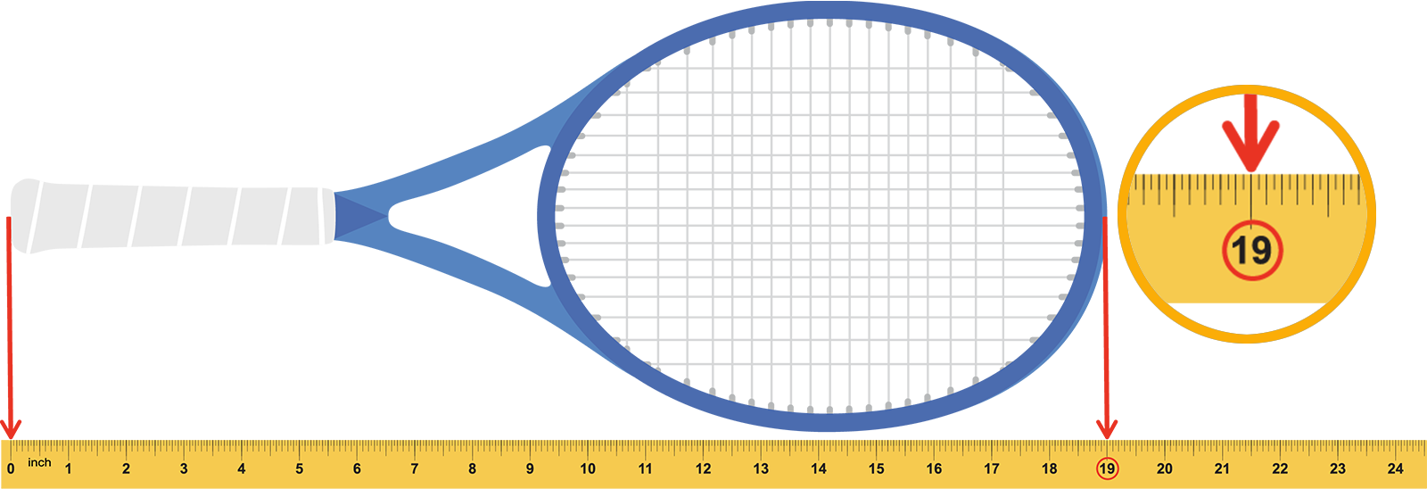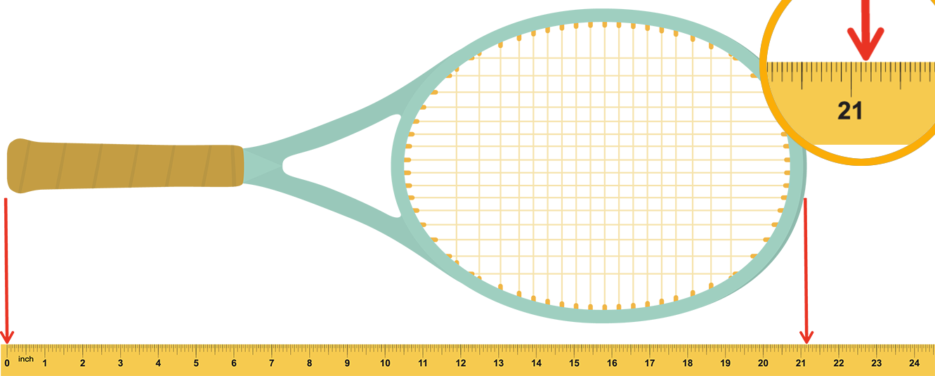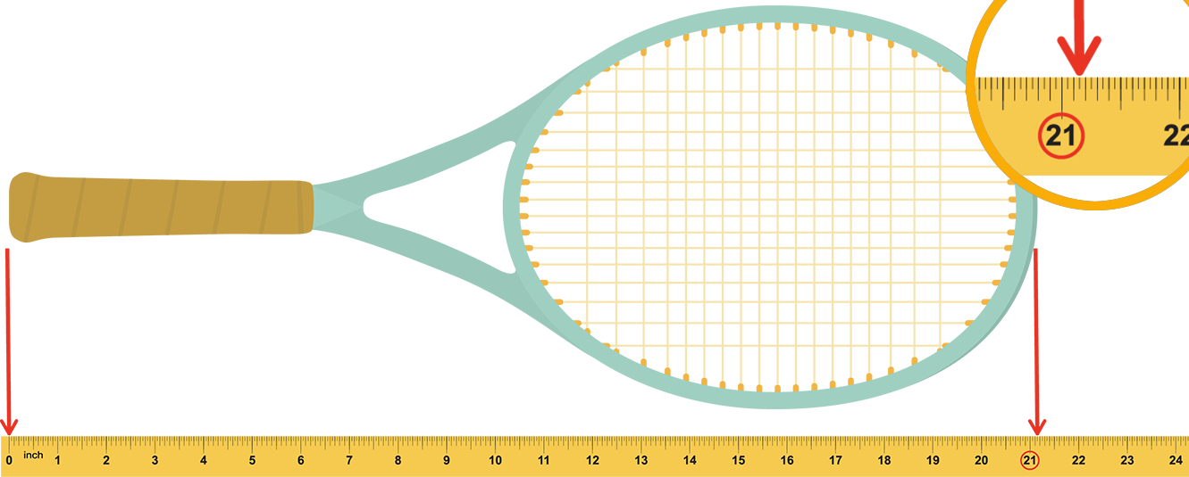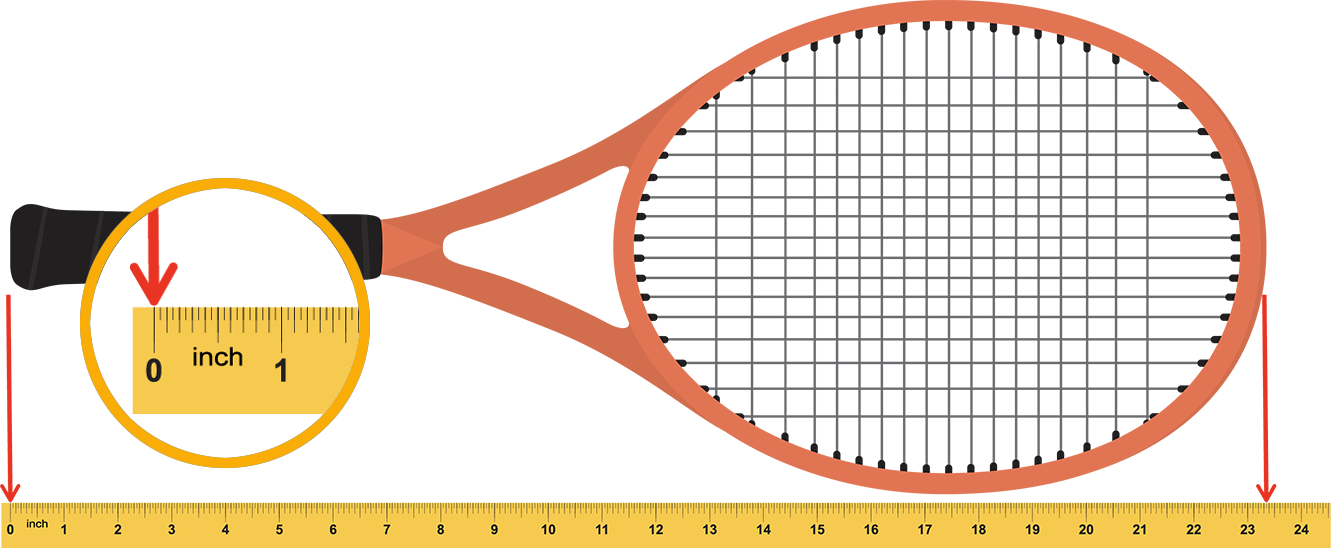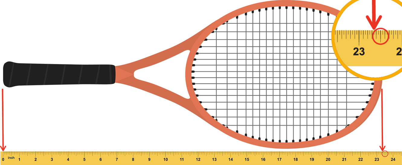 A tennis racket lined up with a ruler. The very end of the handle is lined up with the zero on the ruler. The other end of the tennis racket lines up with the half inch line after twenty three inches. The half inch mark is circled.