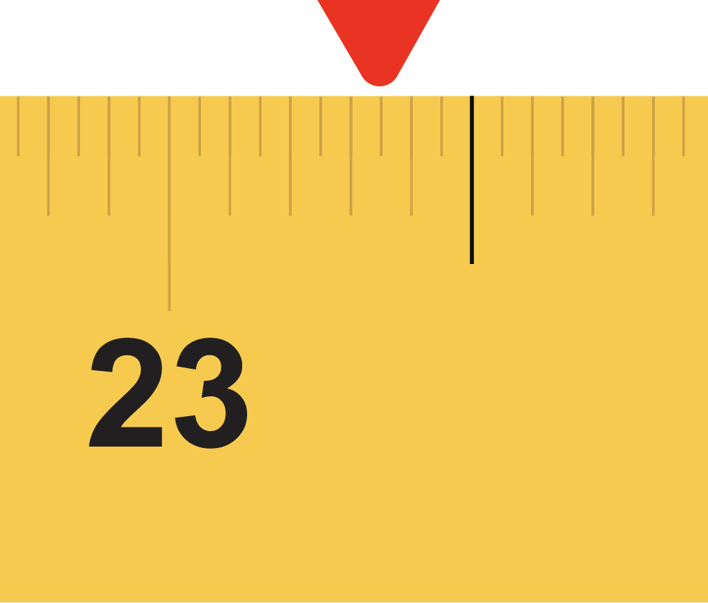 Now find the half-inch line. We can see that the end of the racket is between 23 and the half-inch line.
