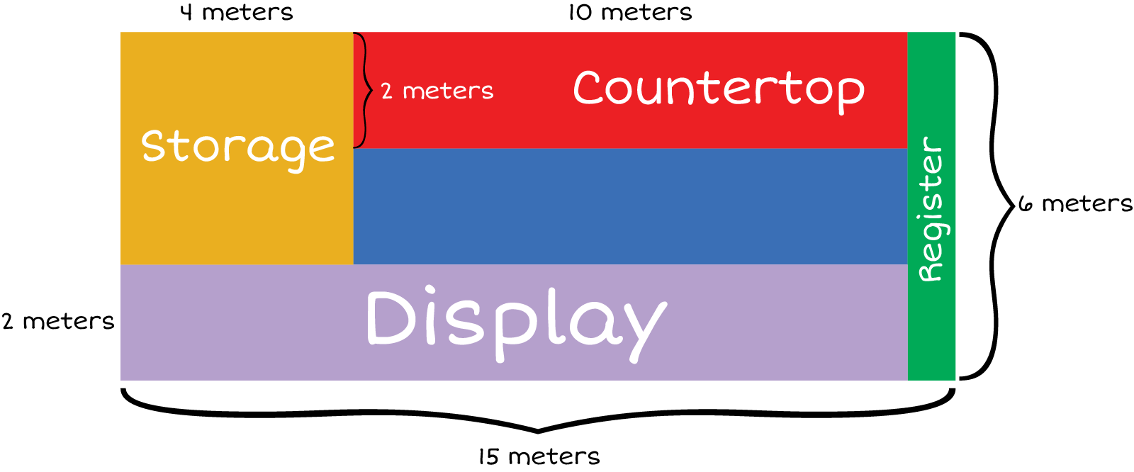 A large area. The first area is labelled storage its top length is measures 4 meters. half of its width is 2 meters. The second section is labelled counter top. Its length is 10 meters and width is 2 meters. The third section is labelled register is width is 6 meters and legth is not labelled. The fourth section is labelled display and has a width of 2 meters its length is not labelled. There is a fifth section in the middle that is unmarked but is 10 meters in lenght and is half the width of the storage.