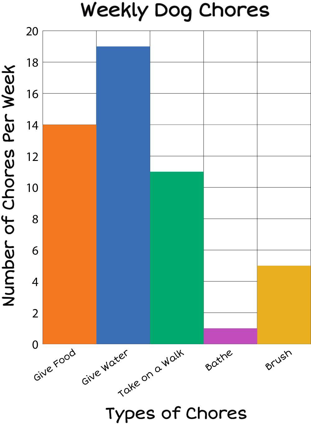 Bar Graph Chart: Title: Weekly Dog chores Scale: Number of Chores Per Week 0,2,4,6,8,10,12,14,16,18,20. Types of Chores: Give Food 14, Give Water 19, Take on a Walk 13, Bathe 1, Brush 5.